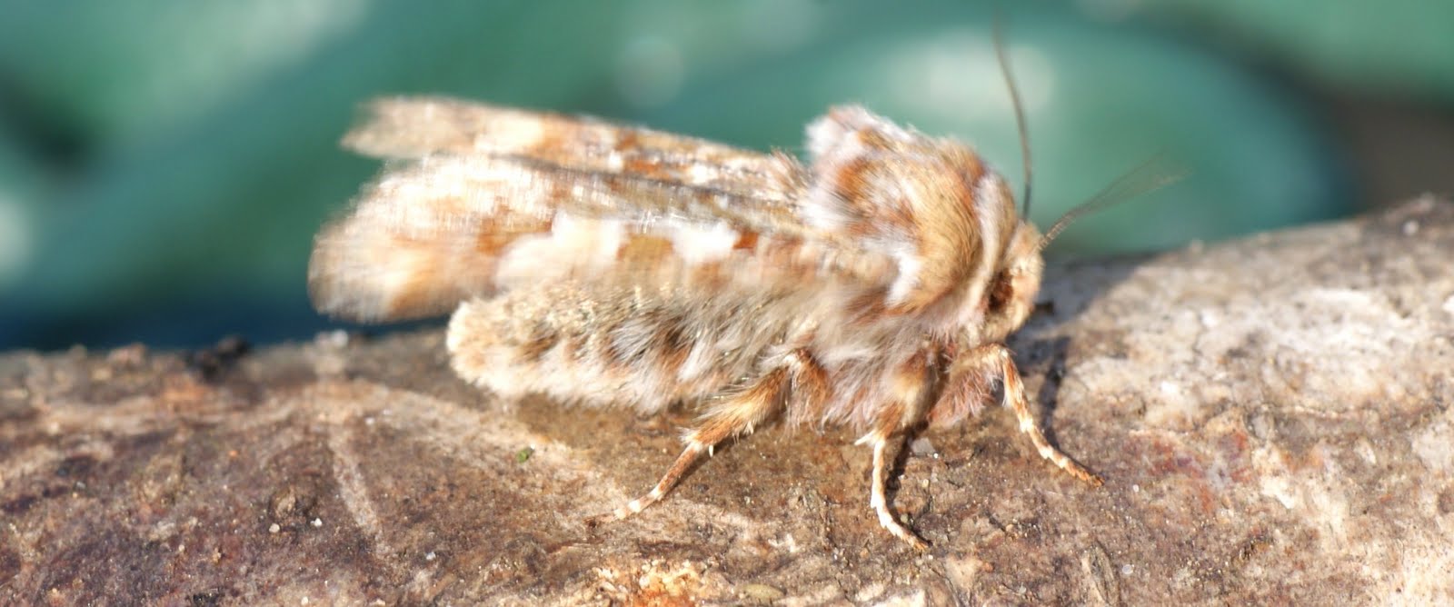 Then, this morning, I looked into the trap to find yet another first for the garden....and another beauty, this time the Pine Beauty. The photo's a bit blurred because the moth is in the process of shivering its wings, warming up the flight muscles prior to taking off, which it did a few moments after this picture was taken!